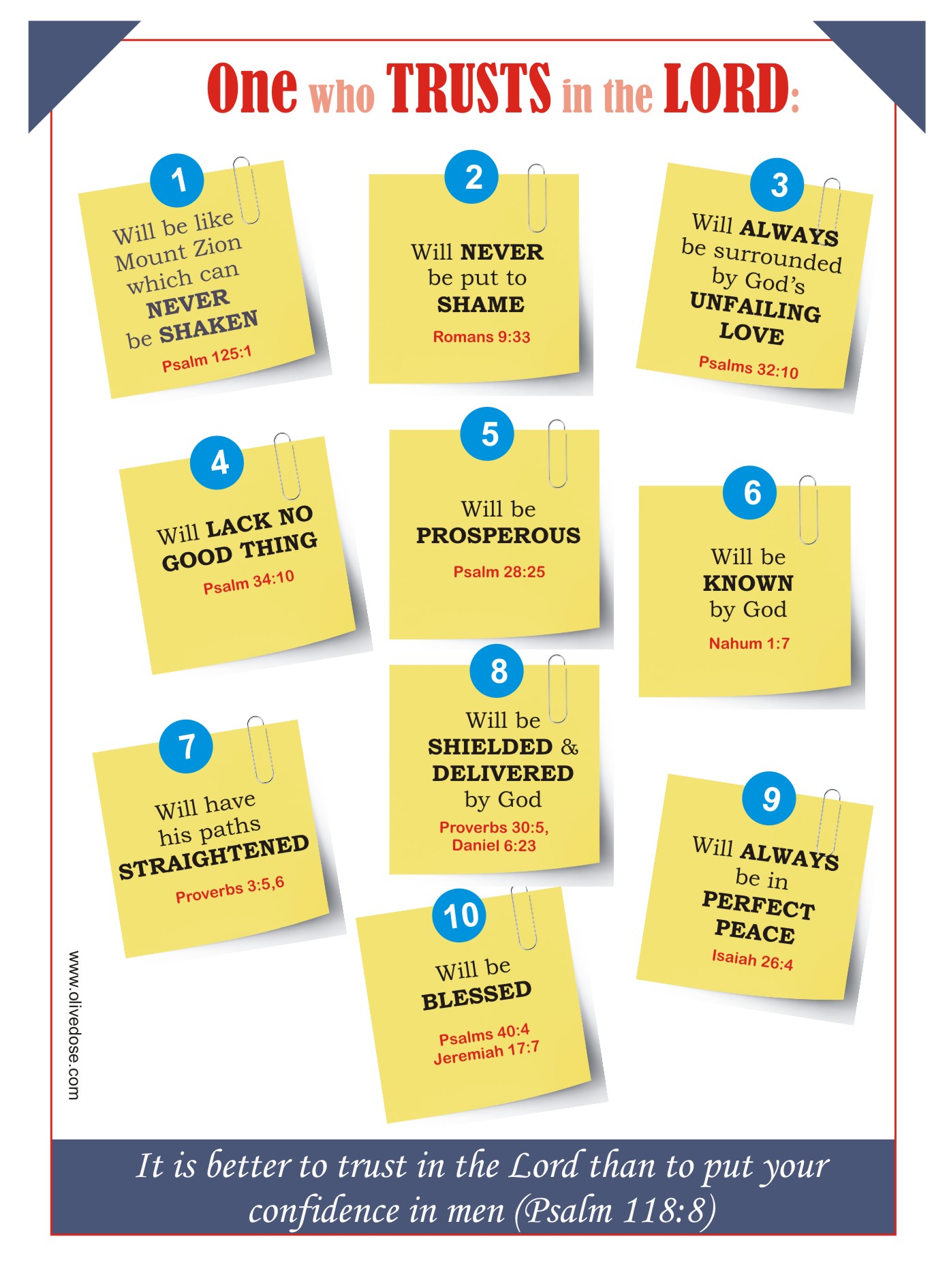 The Bible says “It is better to trust in the Lord than to put your confidence in men.” (Psalm 118:8). If you are leaning on Jesus, congratulations for the word of God says that you are blessed. Below are ten guarantees of trusting God. If this encourages you, feel free to share it with your friends!